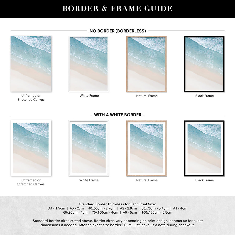 Prints are shown in a frame. If you would like your prints framed, please select a framed option shown. All sizes listed are edge to edge print sizes. If you are purchasing a framed print, please note the final measurement inclusive of the frame will be approx. 4 cm more in height + width than the print size listed. eg- 40 x 50 cm print becomes approx. 44 x 54 cm when framed. Please see our sizing page for help choosing the right size.