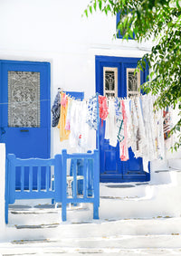 Blue Terrace Washing Santorini - Art Print by Victoria's Stories