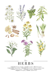 Tea Herbs Chart - Art Print, Poster, Stretched Canvas or Framed Wall Art, Showing White , Black, Natural Frame Colours, No Frame (Unframed) or Stretched Canvas, and With or Without White Borders