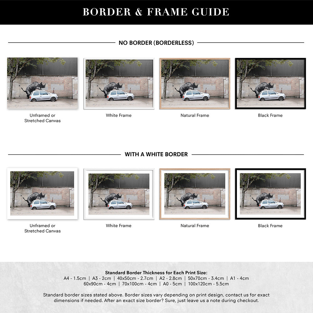 Prints are shown in a frame. If you would like your prints framed, please select a framed option shown. All sizes listed are edge to edge print sizes. If you are purchasing a framed print, please note the final measurement inclusive of the frame will be approx. 4 cm more in height + width than the print size listed. eg- 40 x 50 cm print becomes approx. 44 x 54 cm when framed. Please see our sizing page for help choosing the right size.