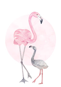 Flamingo Mother & Baby in Watercolours - Art Print, Poster, Stretched Canvas or Framed Wall Art, Showing White , Black, Natural Frame Colours, No Frame (Unframed) or Stretched Canvas, and With or Without White Borders