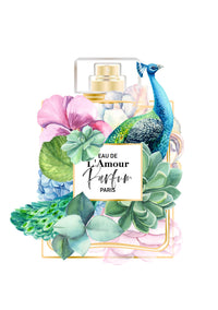 Floral Perfume Bottle | Peacock - Art Print, Poster, Stretched Canvas or Framed Wall Art, Showing White , Black, Natural Frame Colours, No Frame (Unframed) or Stretched Canvas, and With or Without White Borders