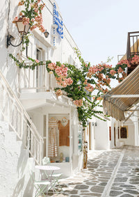 Santorini in Spring | White Terrace Shops - Art Print by Victoria's Stories